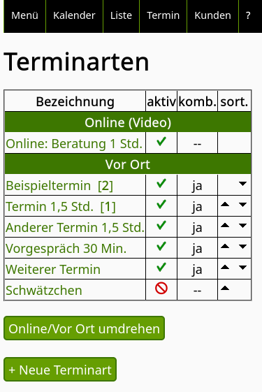 Sie können Terminarten in Ihre Liste mit aufnehmen, die Sie nicht online buchbar machen wollen. Sie selber können diese Terminart dann aber trotzdem noch vergeben, wenn der Klient oder die Klientin den Termin in Ihrer Gegenwart oder telefonisch macht.