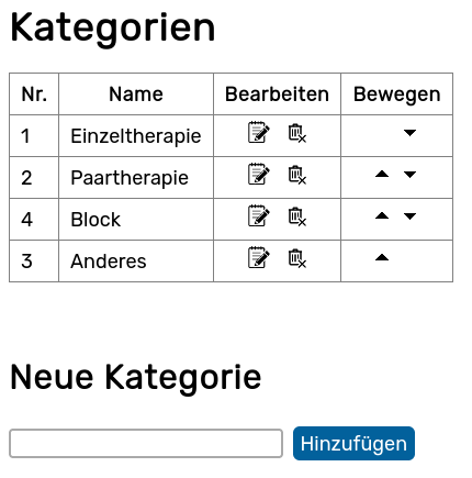 Seit Version 4.0 können Sie Ihre Terminarten in Kategorien einteilen. Das ist optional und empfiehlt sich, wenn Sie viele sehr verschiedene Leistungen anbieten. Legen Sie dazu beliebig viele Kategorien an.